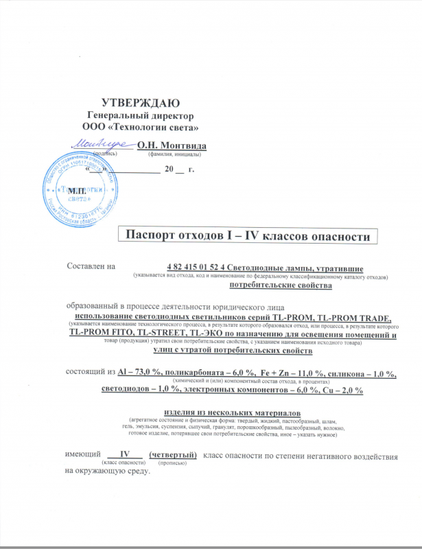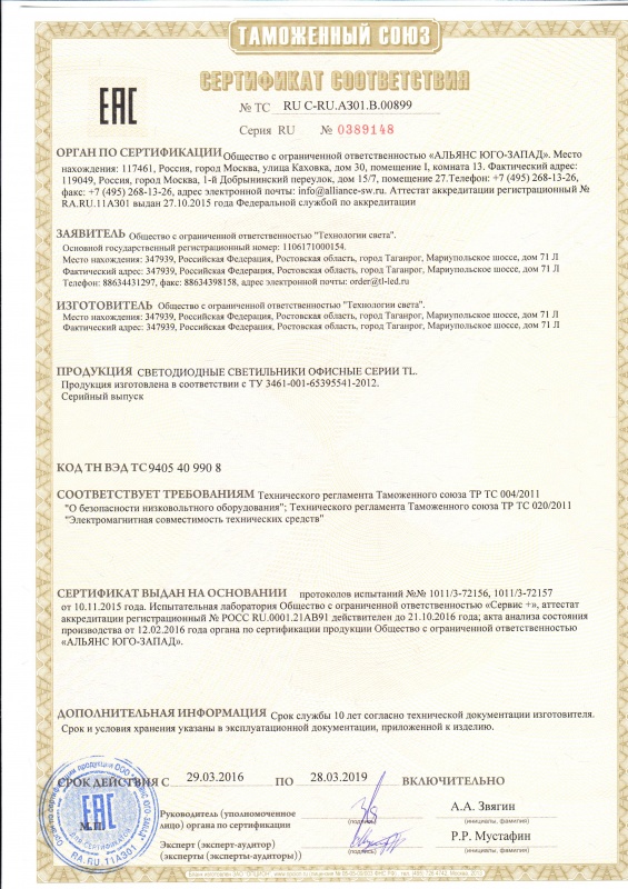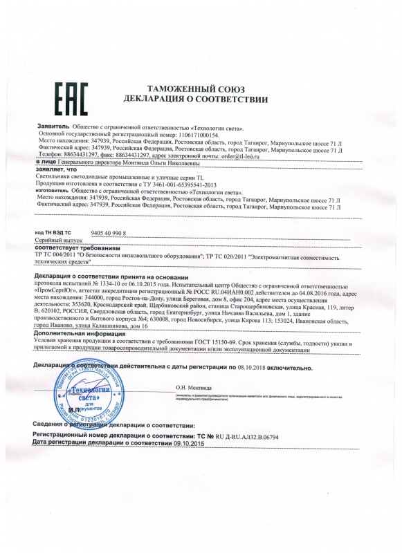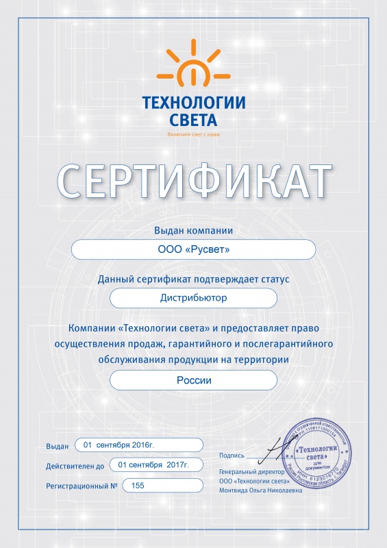 Сертификат официального дистрибьютора ООО "Технологии света"